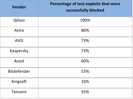 在COSEINC測試中,360安全衛(wèi)士攔截全部15次漏洞攻擊,防御成功率排名第一;Avira(小紅傘)成功攔截12次攻擊,以80%的攔截率排名第二;卡巴斯基和AVG均攔截11次攻擊,并列第三位。