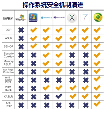 360XP盾甲的這些安全特性加固了XP系統(tǒng)以及Office、IE瀏覽器的安全性弱點。同時可以看到,anti stack pivot和anti-rop這樣的安全特性,在最新的Win8.1和蘋果操作系統(tǒng)也不具備。再加上沙箱隔離防護措施,即使是遍布漏洞的XP系統(tǒng),穿上360XP盾甲后,黑客也難以攻破。
